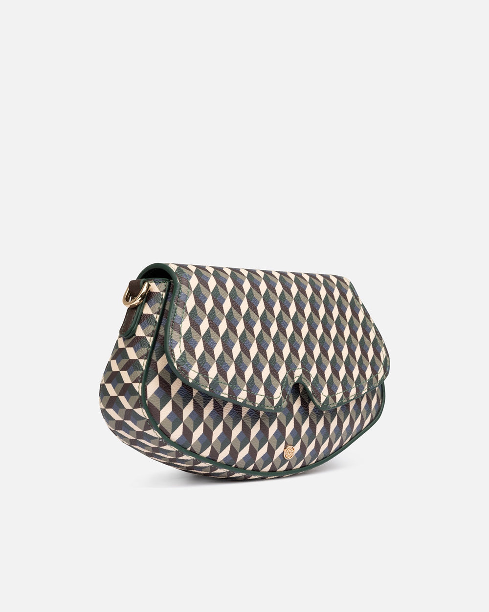 Borsa compatta con stampa geometrica nei toni del bianco, marrone e verde, perfetta per aggiungere un tocco moderno e sofisticato a qualsiasi outfit. Il suo design con patta ondulata e chiusura magnetica aggiunge un dettaglio distintivo. Leggera e funzionale, è ideale per portare con stile l'essenziale sia di giorno che di sera.