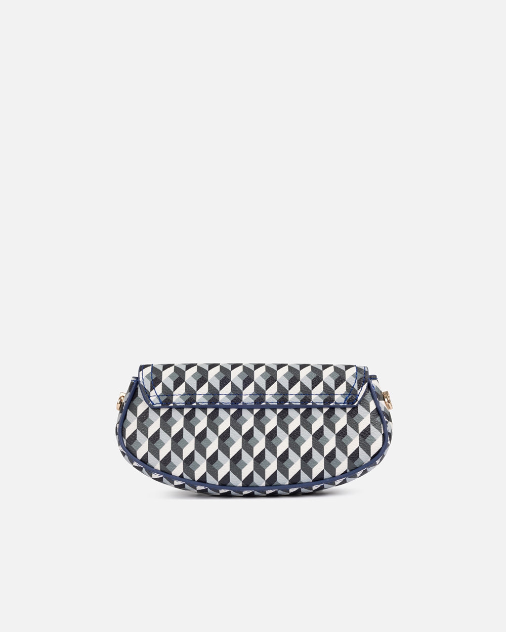 Custodia per occhiali con stampa geometrica nei toni del bianco, nero e blu navy, progettata per proteggere i tuoi occhiali con stile. La sua struttura compatta e leggera è dotata di patta ondulata e chiusura magnetica frontale che conferisce un tocco distintivo. Ideale da portare in borsa e tenere al sicuro i tuoi occhiali in ogni momento.